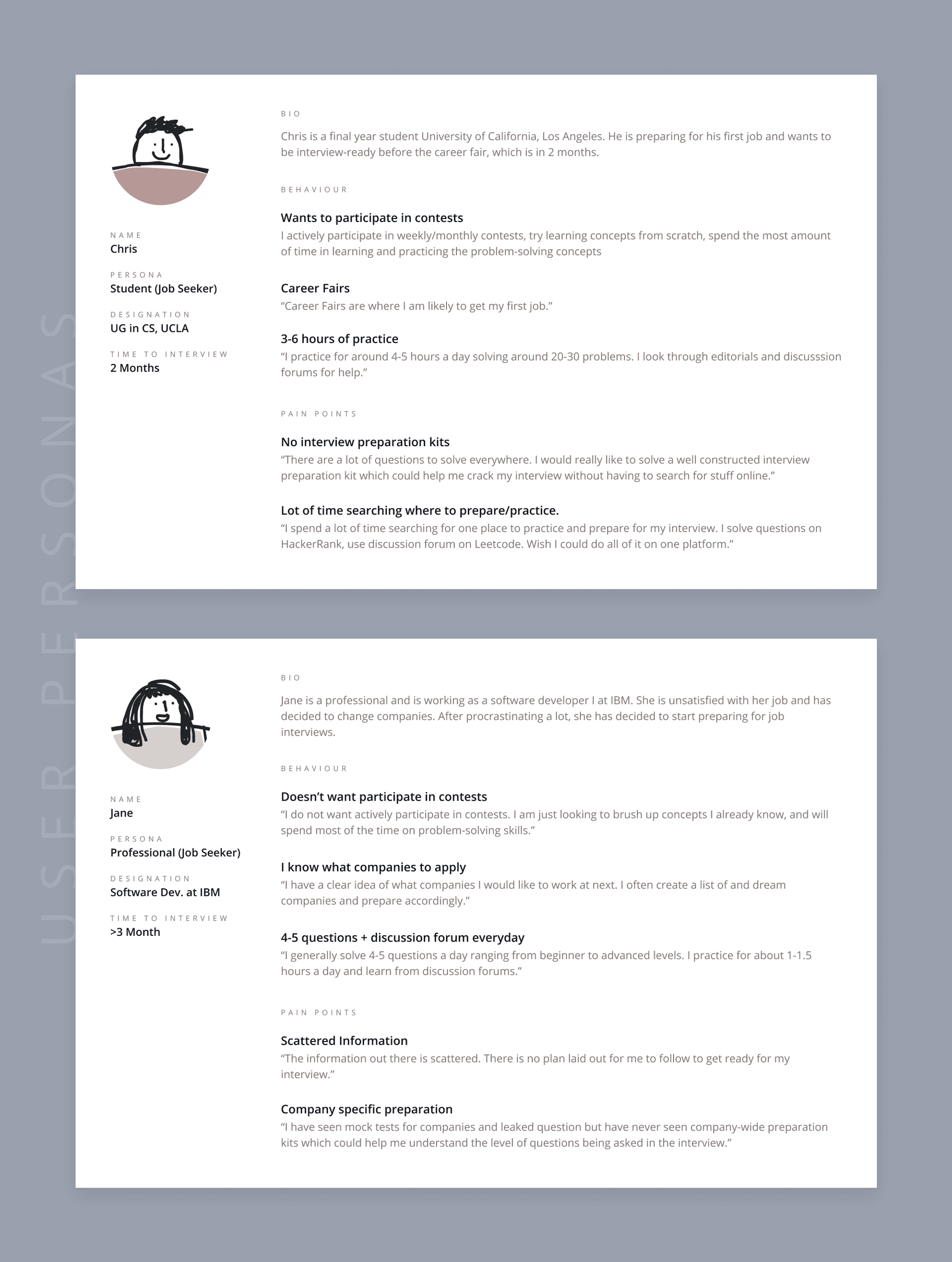 Based on the interviews, we built out two key personas that aligned with our primary persona: Job Seeker.