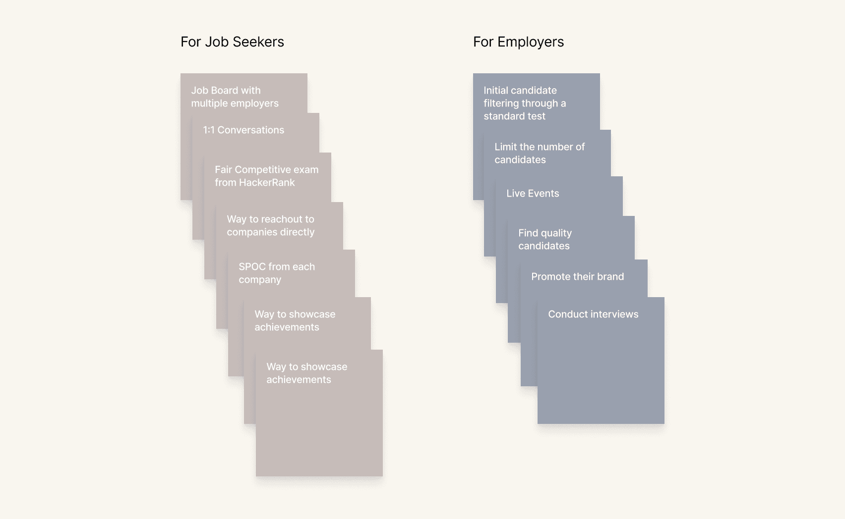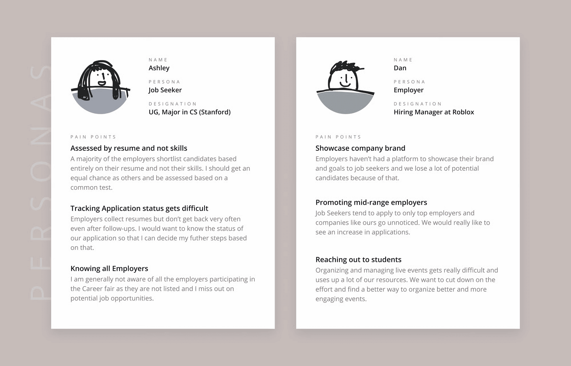 We interviewed both of them to learn more about traditional job fairs and figure out a way to make an online version of these career fairs. Their wants and problems helped us figure out better what we should be building.