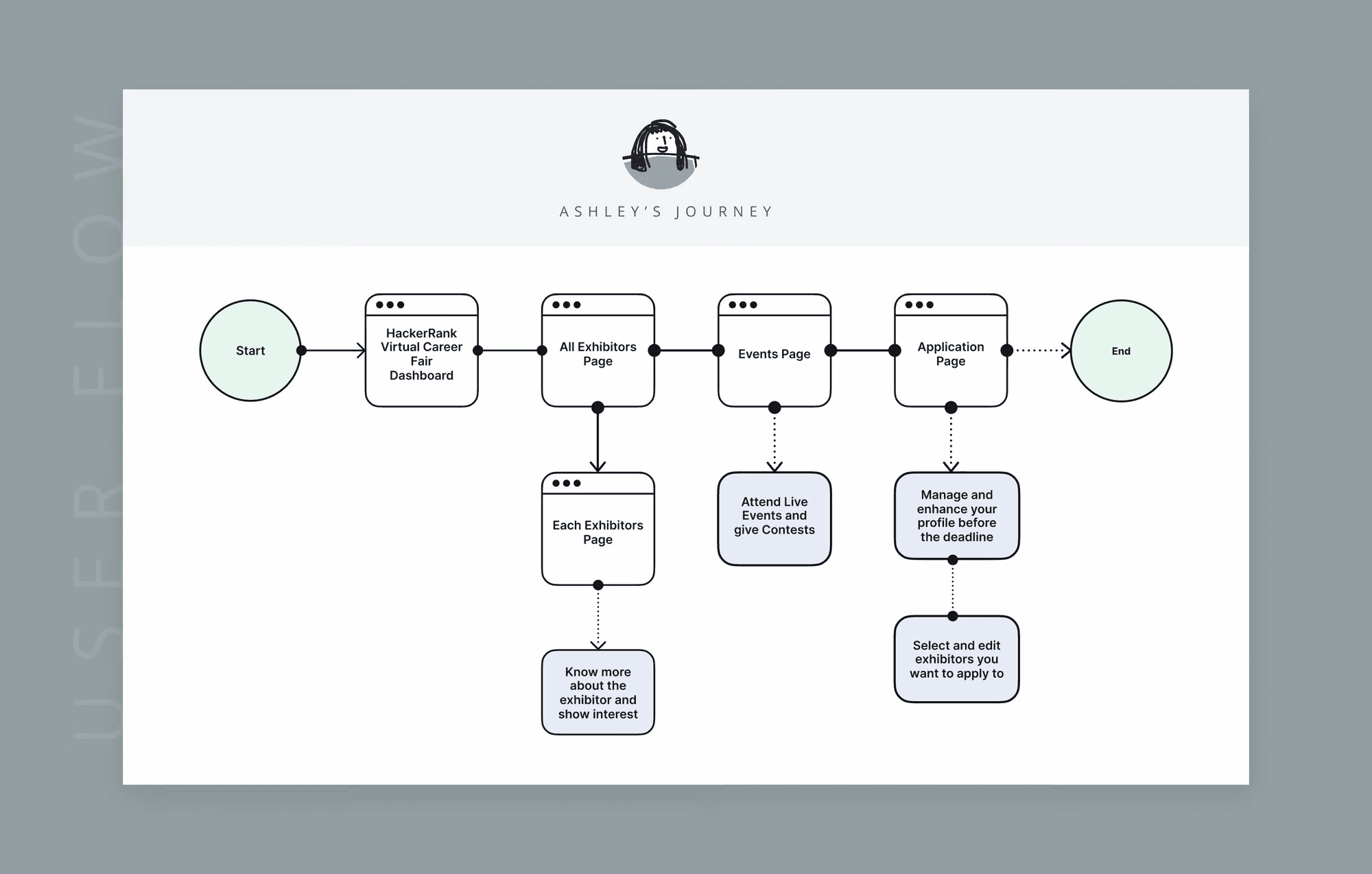 Once we decided which features were most important, we put together the main user flow for both personas. The goal was to make the experience feel a lot like what people do at real-life career fairs, so the features were put in those specific journeys.
